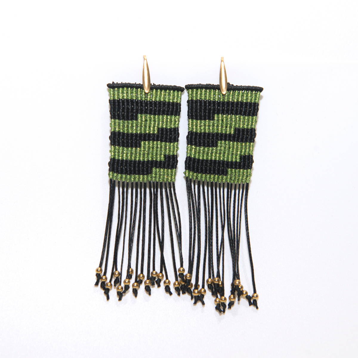 Σκουλαρίκια macrame ADETOUN λαχανί μεταλιζέ μαύρο με κηροκλωστή ανθεκτική στο νερό χωρίς να χάνει το χρώμα της. Με ατσάλινες χάντρες και ατσάλινο κούμπωμα.