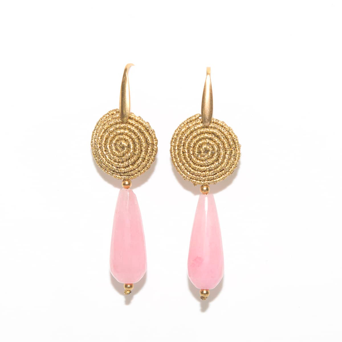 Σκουλαρίκια macrame SPIRA χρυσά χάντρα νεφρίτη ροζ με κηροκλωστή ανθεκτική στο νερό χωρίς να χάνει το χρώμα της.