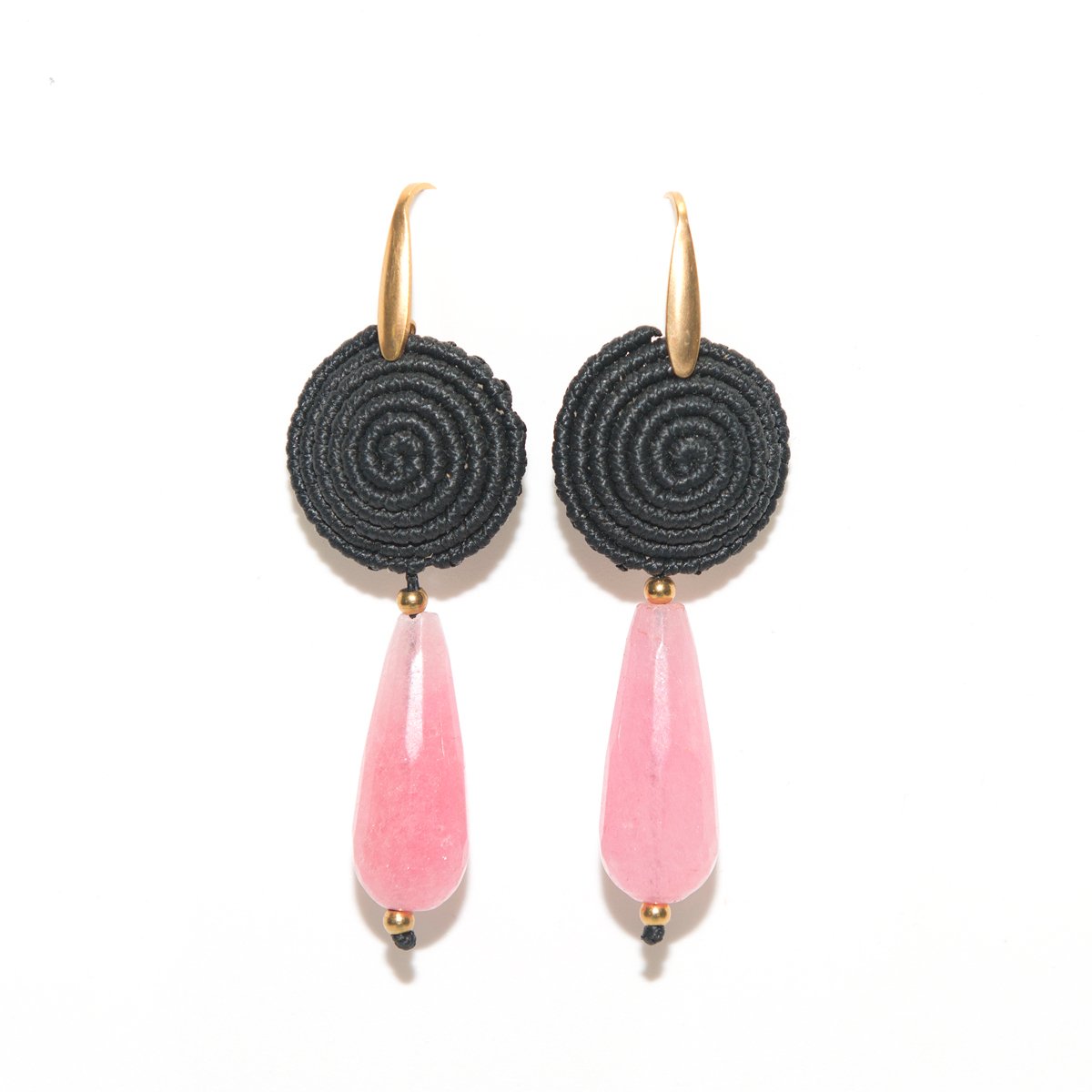 Σκουλαρίκια macrame SPIRA μαύρα με χάντρα νεφρίτη ροζ με κηροκλωστή ανθεκτική στο νερό χωρίς να χάνει το χρώμα της.