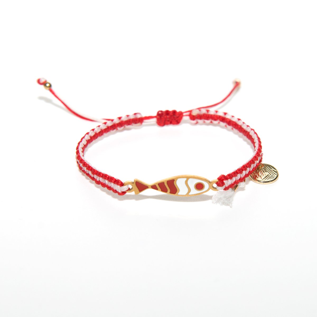 Βραχιόλι macrame μαρτάκι ψάρι κόκκινο λευκό με κηροκλωστή ανθεκτική στο νερό χωρίς να χάνει το χρώμα της. Με κούμπωμα αυξομείωσης.