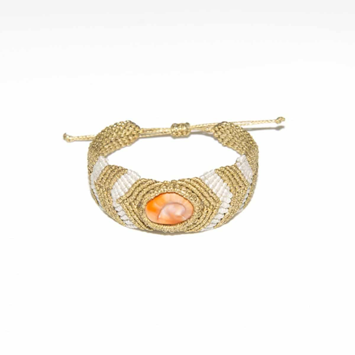 Βραχιόλι macrame ΜΑΤΙ ΘΑΛΑΣΣΑΣ χρυσό λευκό με βασικό φυσικό υλικό ένα ιδιαίτερο κοχύλι, το τυχερό ματάκι της θάλασσας ή αλλιώς το μάτι της Παναγιάς.