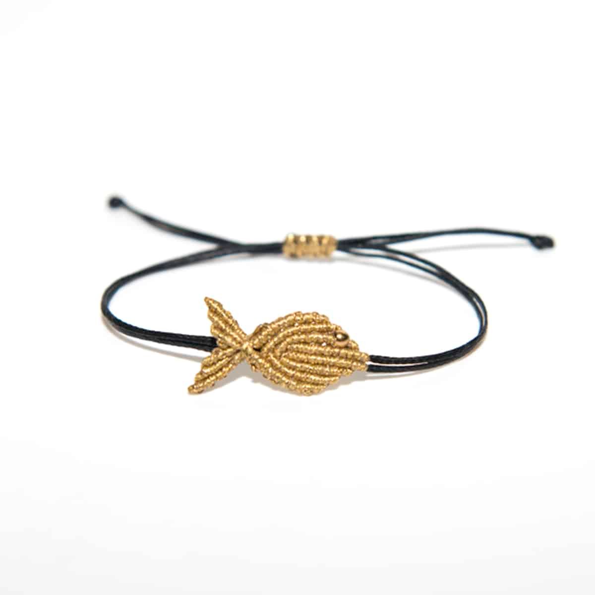 Βραχιόλι macrame ψάρι χρυσό με κηροκλωστή ανθεκτική στο νερό χωρίς να χάνει το χρώμα της. Με κούμπωμα αυξομείωσης.