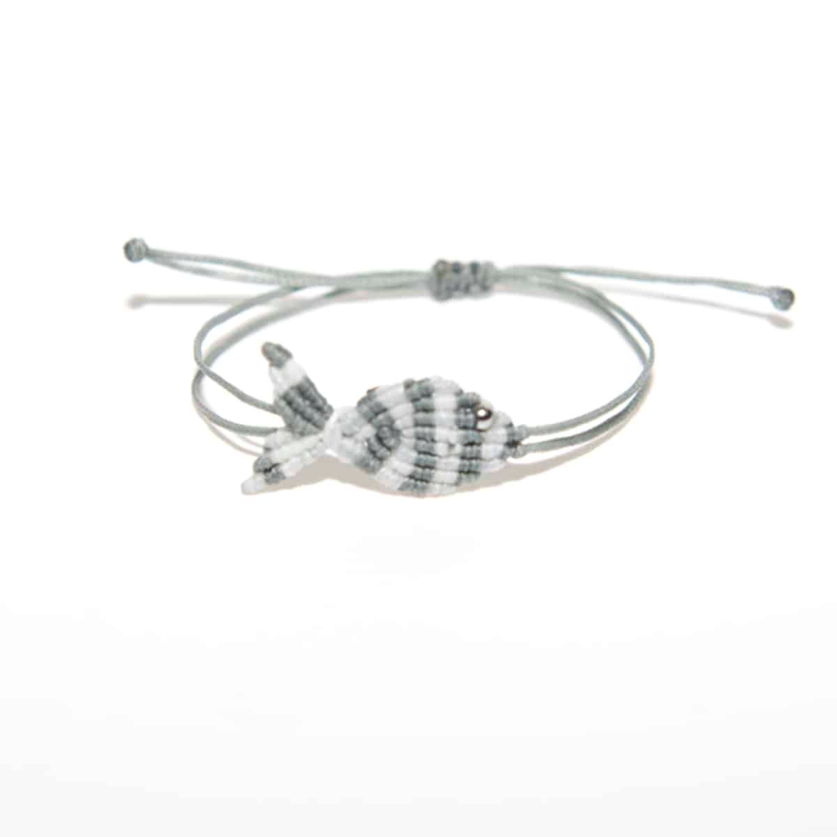 Βραχιόλι macrame ψάρι γκρι λευκό με κηροκλωστή ανθεκτική στο νερό χωρίς να χάνει το χρώμα της. Με κούμπωμα αυξομείωσης.