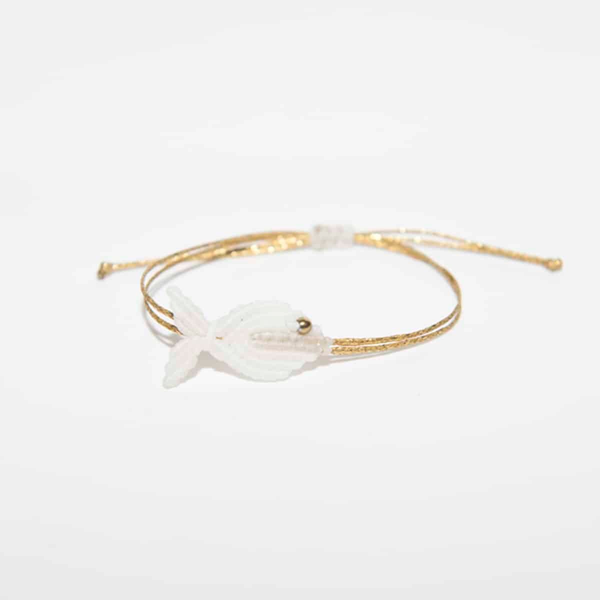 Βραχιόλι macrame ψάρι λευκό με κηροκλωστή ανθεκτική στο νερό χωρίς να χάνει το χρώμα της. Με κούμπωμα αυξομείωσης.