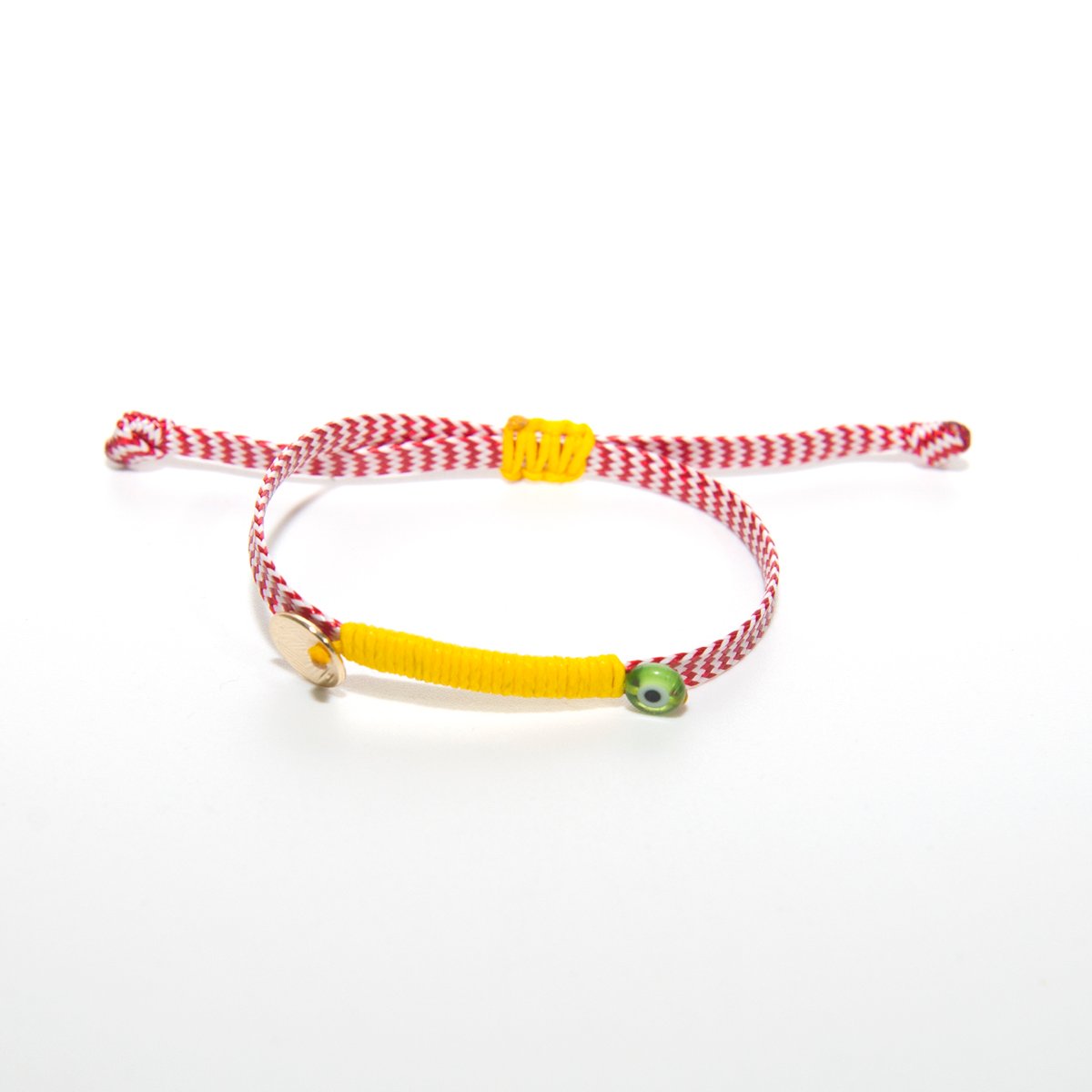 Βραχιόλι μαρτάκι πλακέ κίτρινο με κηροκλωστή ανθεκτική στο νερό χωρίς να χάνει το χρώμα της. Με κούμπωμα αυξομείωσης.